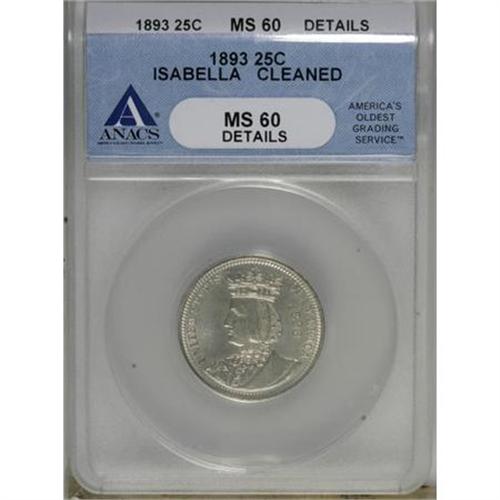 <B>1893 25C Isabella Quarter--Cleaned--ANACS. MS60 Details.</B></I> NGC Census: (21/2804). PCGS Population (57/3619). Mintage: 24,214. Numismedia Wsl. Price for NGC/PCGS coin in MS60: $530. (#9220)<BR><BR><b>Shipping:</b> Coins & Currency (<a target="_blank" href="http://www.heritageauctions.com/common/shipping.php">view shipping information</a>)