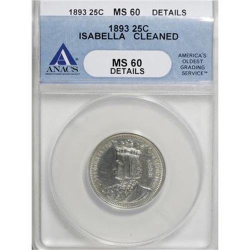 <B>1893 25C Isabella Quarter--Cleaned--ANACS. MS60 Details.</B></I> NGC Census: (21/2802). PCGS Population (57/3616). Mintage: 24,214. Numismedia Wsl. Price for NGC/PCGS coin in MS60: $530. (#9220)<BR><BR><b>Shipping:</b> Coins & Currency (<a target="_blank" href="http://www.heritageauctions.com/common/shipping.php">view shipping information</a>)