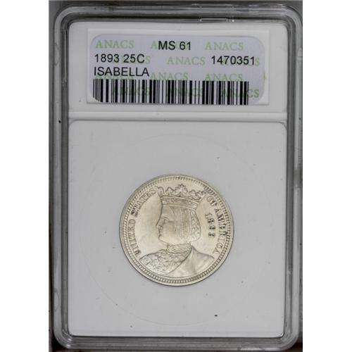 <B>1893<25C> Isabella Quarter MS61 ANACS.</B></I> Vibrant satin sheen illuminates this honey-gold and stone-gray early silver commemorative. Sharply struck and relatively unabraded, although subtle stains are noted along the borders. <BR><BR><B>Important notice:</B> Heritage usually auctions material at the rate of 200-250 lots per hour. On some occasions eBay Live bid software or the Internet may not be able to keep up with the pace of the auction. We recommend placing a realistic absentee bid now as insurance to avoid disappointment. Occasionally the auctioneer may eliminate or reject an eBay Live bid, and the auctioneer may also reopen a lot after the close of the eBay live bidding (usually because we missed an audience bid), and may reject your bid even if it shows you as the winning bidder. By bidding via eBay Live, you agree that Heritage may award the lot to another bidder at its sole discretion under the circumstances described above or any other reasonable circumstances. Since eBay bids are not shown to us until we open the lot on the floor, we treat those bids just like floor bids. In most cases the floor responds before the eBay bid is presented to us, due to Internet lag time, so for consistency we have made it a policy that floor bids are always considered first over tie eBay live bids. Also please note that all Heritage lots purchased through eBay Live carry a 20% Buyer's Premium. Please make sure you read the Terms and Conditions before you bid. This lot is being auctioned in conjunction with a live floor auction by Heritage Galleries & Auctioneers. All final auction and invoice information will be supplied by Heritage Galleries & Auctioneers, and all other information should be considered preliminary. Lot:4809 <BR><BR><B>Winning Notification and Billing:</B> After the FINAL session in this auction is complete, Heritage will send e-mail and snail mail invoices. This process normally takes several days. All final auction and invoice information will be supplied by Heritage Galleries & Auctioneers, and all other information should be considered preliminary. <BR><BR>This auction will be conducted on a live auction floor and over the Internet through eBay Live. If you choose to place an absentee bid, please take a moment to <font color='#0000ff'><u><a href='http://pages.ebay.com/liveauctions/help/before/laabsentee.html'>learn how eBay Live absentee bidding works</a></u></font><font color='#000000'>