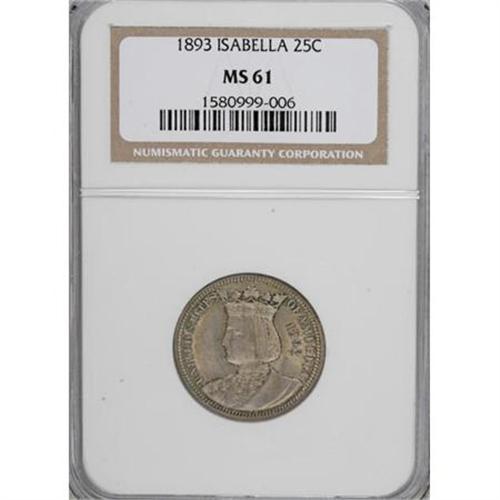 <B>1893 25C Isabella Quarter MS61 NGC.</B></I> NGC Census: (154/2606). PCGS Population (170/3361). Mintage: 24,214. Numismedia Wsl. Price for NGC/PCGS coin in MS61: $550. (#9220)<BR><BR><b>Shipping:</b> Coins & Currency (<a target="_blank" href="http://www.heritageauctions.com/common/shipping.php">view shipping information</a>)