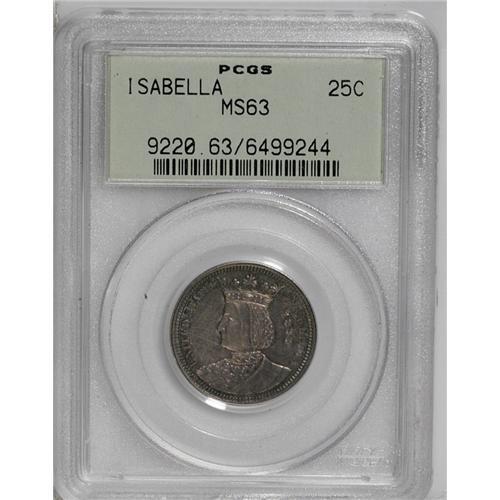 <B>1893<25C> Isabella Quarter MS63 PCGS.</B></I> Lustrous with deep violet patina accented by apricot. Boldly struck with small, thin abrasions that restrict the grade. Housed in a green label holder.