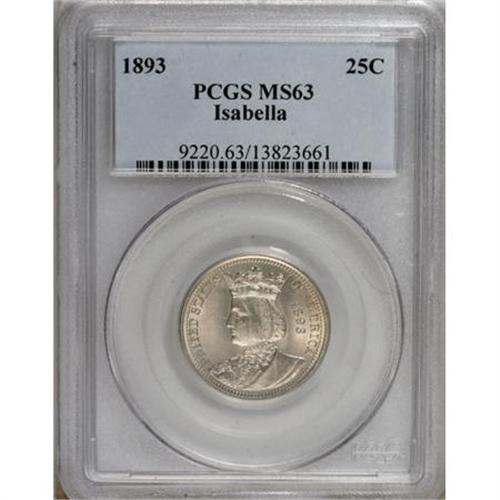 <B>1893 25C Isabella Quarter MS63 PCGS.</B></I> A strongly lustrous Select example that has better-than-average detail, evidenced by the unbroken line of the thread on the reverse. Hints of sky-blue and lemon-gold patina grace the fields.<BR><BR><b>Shipping:</b> Coins & Currency (<a target="_blank" href="http://www.heritageauctions.com/common/shipping.php">view shipping information</a>)