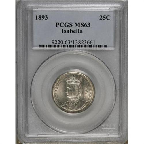 <B>1893 25C Isabella Quarter MS63 PCGS.</B></I> A strongly lustrous Select example with above-average detail, evidenced by the unbroken line of the thread on the reverse. Hints of sky-blue and lemon-gold patina grace the fields of this pleasing coin.<BR><BR><b>Shipping:</b> Coins & Currency (<a target="_blank" href="http://www.heritageauctions.com/common/shipping.php">view shipping information</a>)