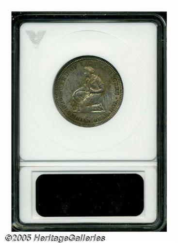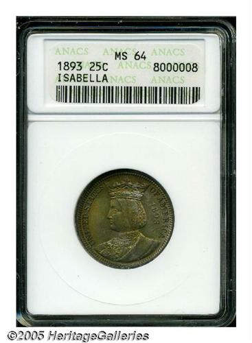 <B>1893<25C> Isabella Quarter MS64 ANACS.</B></I> Well struck with lovely lime-green, golden-orange and mauve-gray toning over both sides. Lustrous and seemingly mark-free, a conservatively graded near-Gem.