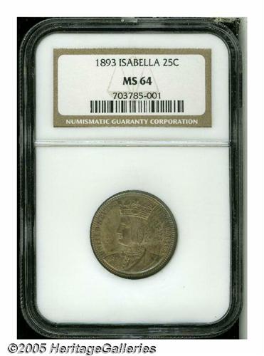 <B>1893<25C> Isabella Quarter MS64 NGC.</B></I> A thick mixture of sunset-red and gray toning is accented with subtle hues of blue. A well struck, near-Gem example with no mentionable flaws.