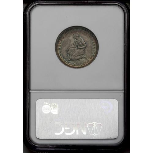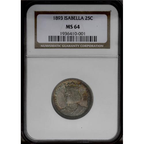 <B>1893<25C> Isabella Quarter MS64 NGC.</B></I> Boldly struck with satin luster and variegated red-orange, mauve-gray, aqua, and dark-green toning on both sides. A faint pinscratch in the upper reverse field area, just behind the head of the kneeling female figure, is the only noticeable surface distraction. <BR><BR><B>Important notice:</B> Heritage usually auctions material at the rate of 200-250 lots per hour. On some occasions eBay Live bid software or the Internet may not be able to keep up with the pace of the auction. We recommend placing a realistic absentee bid now as insurance to avoid disappointment. Occasionally the auctioneer may eliminate or reject an eBay Live bid, and the auctioneer may also reopen a lot after the close of the eBay live bidding (usually because we missed an audience bid), and may reject your bid even if it shows you as the winning bidder. By bidding via eBay Live, you agree that Heritage may award the lot to another bidder at its sole discretion under the circumstances described above or any other reasonable circumstances. Since eBay bids are not shown to us until we open the lot on the floor, we treat those bids just like floor bids. In most cases the floor responds before the eBay bid is presented to us, due to Internet lag time, so for consistency we have made it a policy that floor bids are always considered first over tie eBay live bids. Also please note that all Heritage lots purchased through eBay Live carry a 20% Buyer's Premium. Please make sure you read the Terms and Conditions before you bid. This lot is being auctioned in conjunction with a live floor auction by Heritage Galleries & Auctioneers. All final auction and invoice information will be supplied by Heritage Galleries & Auctioneers, and all other information should be considered preliminary. Lot:4816 <BR><BR><B>Winning Notification and Billing:</B> After the FINAL session in this auction is complete, Heritage will send e-mail and snail mail invoices. This process normally takes several days. All final auction and invoice information will be supplied by Heritage Galleries & Auctioneers, and all other information should be considered preliminary. <BR><BR>This auction will be conducted on a live auction floor and over the Internet through eBay Live. If you choose to place an absentee bid, please take a moment to <font color='#0000ff'><u><a href='http://pages.ebay.com/liveauctions/help/before/laabsentee.html'>learn how eBay Live absentee bidding works</a></u></font><font color='#000000'>