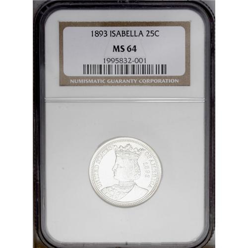 <B>1893<25C> Isabella Quarter MS64 NGC.</B></I> Sharply struck, with essentially untoned, highly lustrous surfaces. The grade is defined by minute contact marks and luster grazes scattered over each side.