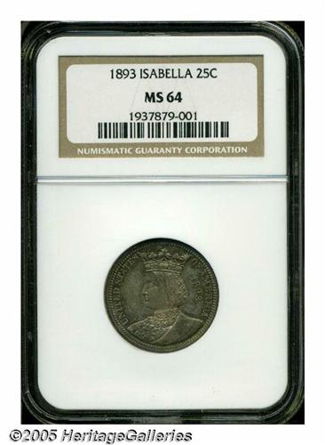 <B>1893<25C> Isabella Quarter MS64 NGC.</B></I> This well struck Isabella quarter reveals a multi-toned assemblage of gray, cobalt-blue, magenta, and yellow-green patination over lustrous surfaces. All of the design elements display well struck features. A few inconspicuous marks define the grade.