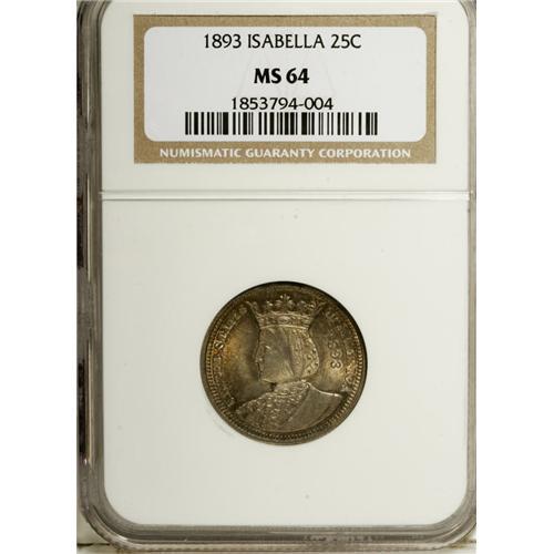 <B>1893 25C Isabella Quarter MS64 NGC.</B></I> Warm reddish-orange and cool violet patina graces this lustrous near-Gem. This pleasing piece has above-average detail on the devices.<BR><BR><b>Shipping:</b> Coin/Currency (<a target="_blank" href="http://www.heritageauctions.com/common/shipping.php">view shipping information</a>)