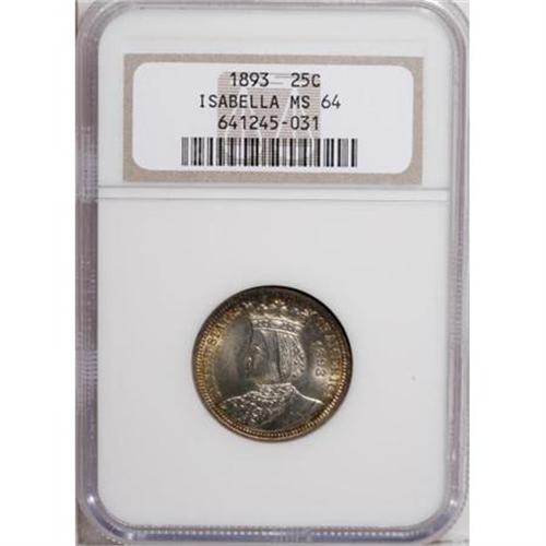 <B>1893 25C Isabella Quarter MS64 NGC.</B></I> Golden-brown and cobalt-blue grace the peripheries of this thoroughly lustrous and pinpoint-sharp near-Gem. The fields are splendidly smooth.<BR><I>From The Cary & Cheryl Porter Collection, Part Three.</B></I><BR><BR><b>Shipping:</b> Coins & Currency (<a target="_blank" href="http://www.heritageauctions.com/common/shipping.php">view shipping information</a>)