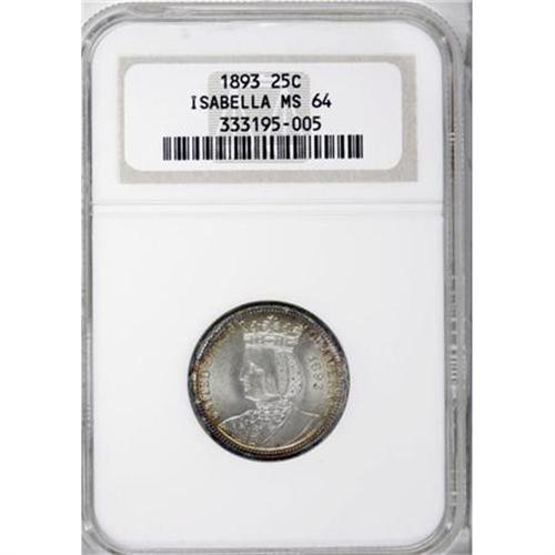 <B>1893 25C Isabella Quarter MS64 NGC.</B></I> Unusually well-defined for this classic commemorative quarter issue with powder-blue and golden-tan patina at the margins. The minimally toned centers offer vibrant luster, and the overall visual appeal is excellent.<BR><BR><b>Shipping:</b> Coins & Currency (<a target="_blank" href="http://www.heritageauctions.com/common/shipping.php">view shipping information</a>)