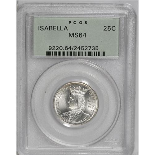 <B>1893<25C> Isabella Quarter MS64 PCGS.</B></I> A brilliant and highly lustrous example of this early classic commemorative. The fields and devices are quite clean for the grade. Housed in a green label holder.