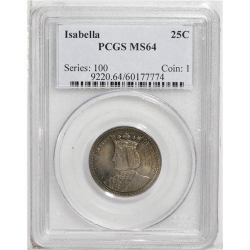 <B>1893<25C> Isabella Quarter MS64 PCGS.</B></I> A well struck and deeply toned example of this early commemorative type. Heavy brownish-green patina covers each side of this vibrant, carefully preserved near-Gem.