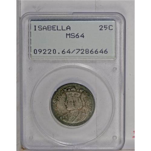 <B>1893<25C> Isabella Quarter MS64 PCGS.</B></I> Cartwheel shimmer readily penetrates the deeply patinated golden-brown, aqua, and dove-gray surfaces. A sharply struck and undisturbed near-Gem. Housed in a first generation holder.