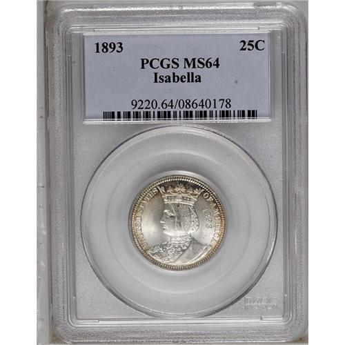 <B>1893<25C> Isabella Quarter MS64 PCGS.</B></I> Choice and highly lustrous, with gold-russet peripheral toning on both sides that surrounds lavender on the reverse. Sharply struck and pleasing overall.