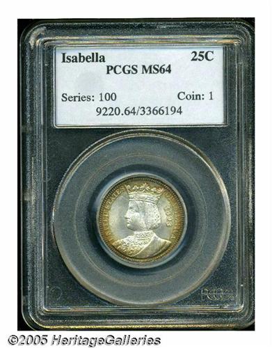 <B>1893<25C> Isabella Quarter MS64 PCGS.</B></I> Fire-red and apple-green colors dominate the borders of this lustrous near-Gem. A few minor grazes accompany the reverse field.