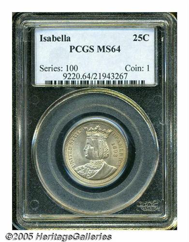 <B>1893<25C> Isabella Quarter MS64 PCGS.</B></I> Frosty silver-gray surfaces emit glowing luster on this near Gem, and the design features are sharply impressed. A couple of minor scuffs are noted in the obverse fields. This is an exceptional opportunity to acquire such a lovely example.