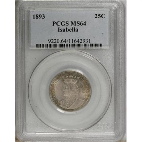 <B>1893 25C Isabella Quarter MS64 PCGS.</B></I> This Isabella quarter displays boldly struck design elements and original rose-gray toning that yields to intermingled red, gold and olive iridescence near the peripheries. Distracting surface blemishes are nonexistent. <BR><BR><b>Shipping:</b> Coins & Currency (<a target="_blank" href="http://www.heritageauctions.com/common/shipping.php">view shipping information</a>)