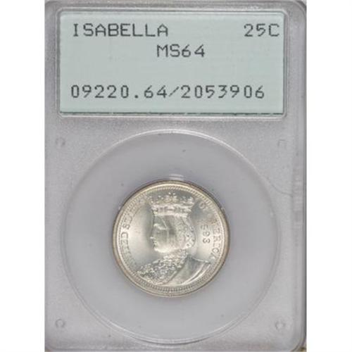 <B>1893 25C Isabella Quarter MS64 PCGS.</B></I> Dazzling luster illuminates this brilliant near-Gem. Well struck and impressively preserved. Encased in a first generation holder.<BR><BR><b>Shipping:</b> Coins & Currency (<a target="_blank" href="http://www.heritageauctions.com/common/shipping.php">view shipping information</a>)