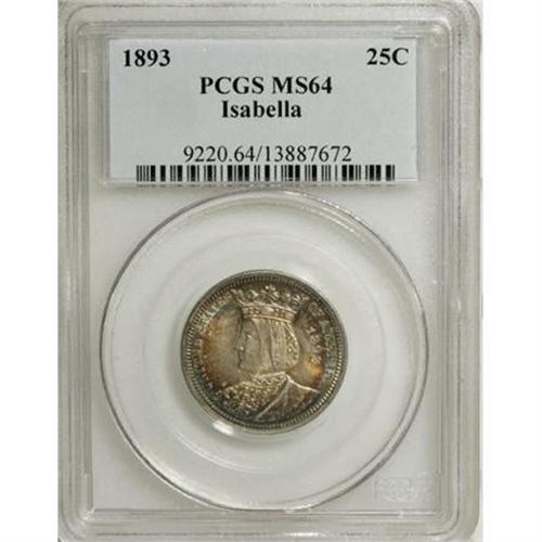 <B>1893 25C Isabella Quarter MS64 PCGS.</B></I> PCGS Population (1017/509). NGC Census: (945/588). Mintage: 24,214. Numismedia Wsl. Price for NGC/PCGS coin in MS64: $1,100. (#9220)<BR><I>From The Frank DuVall Collection of U.S. Commemoratives.</B></I><BR><BR><b>Shipping:</b> Coins & Currency (<a target="_blank" href="http://www.heritageauctions.com/common/shipping.php">view shipping information</a>)