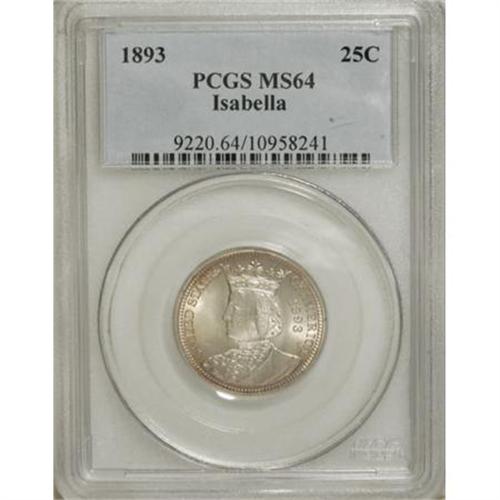 <B>1893 25C Isabella Quarter MS64 PCGS.</B></I> Sharply struck and intensely lustrous, with lovely rose peripheral toning on both sides. The surfaces are impressively preserved and only show a few trivial field marks. A high-end example from the first date of American commemorative coinage. <BR><I>From The Beau Clerc Collection.</B></I><BR><BR><b>Shipping:</b> Coins & Currency (<a target="_blank" href="http://www.heritageauctions.com/common/shipping.php">view shipping information</a>)