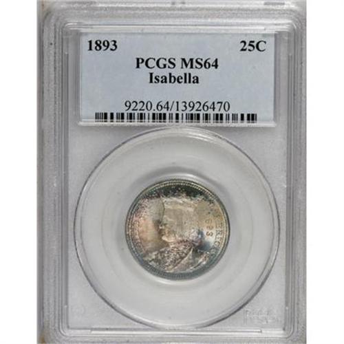 <B>1893 25C Isabella Quarter MS64 PCGS.</B></I> Regions of teal, violet, and peach patina grace the upper obverse and the lower obverse and reverse. Elsewhere, the shining surfaces of this sharply struck early commemorative are essentially untoned.<BR><BR><b>Shipping:</b> Coins & Currency (<a target="_blank" href="http://www.heritageauctions.com/common/shipping.php">view shipping information</a>)