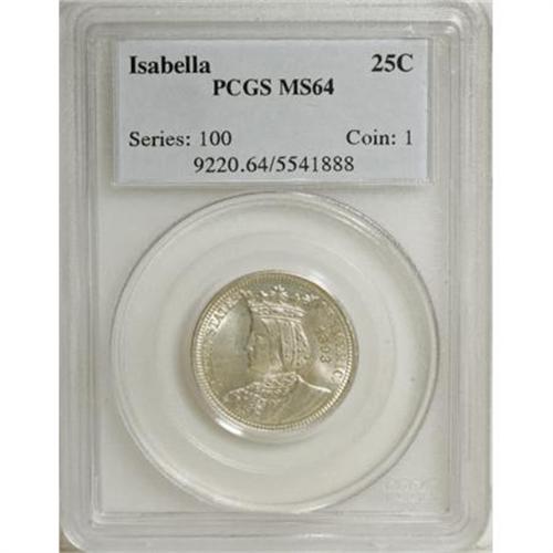 <B>1893 25C Isabella Quarter MS64 PCGS.</B></I> Excellent detail for the issue and lovely luster are the prime draws of this attractive Choice piece. Whispers of golden-tan toning enhance the brilliant silver-white that dominates the surfaces. A great example of the only classic commemorative quarter.<BR><BR><b>Shipping:</b> Coins & Currency (<a target="_blank" href="http://www.heritageauctions.com/common/shipping.php">view shipping information</a>)