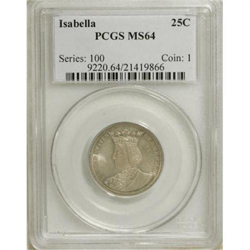 <B>1893 25C Isabella Quarter MS64 PCGS.</B></I> Deep silver-gray patina has settled over the centers, while the margins show elements of peach and orange toning. Strong luster shines through on this attractive near-Gem.<BR><BR><b>Shipping:</b> Coins & Currency (<a target="_blank" href="http://www.heritageauctions.com/common/shipping.php">view shipping information</a>)