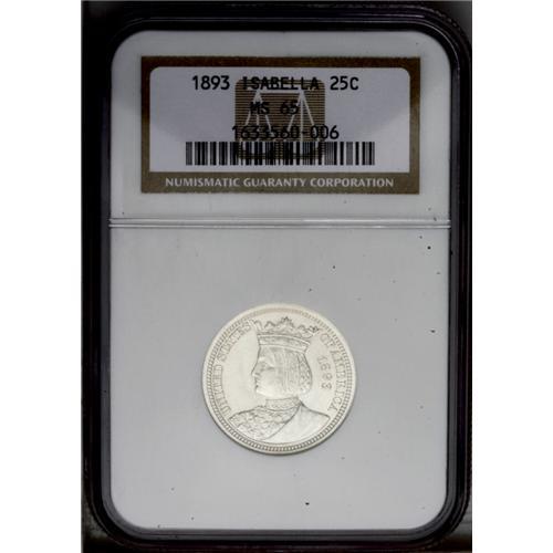 <B>1893<25C> Isabella Quarter MS65 NGC.</B></I> A brilliant, blast-white example of this popular commemorative type, more available than the 1892 issue. Blazing luster, and mark-free to the naked eye. Even under a glass, no mentionable abrasions are seen. Boldly struck as well. A high-end Gem for the collector who believes "brilliant is best." <BR><BR><B>Important notice:</B> Heritage usually auctions material at the rate of 200-250 lots per hour. On some occasions eBay Live bid software or the Internet may not be able to keep up with the pace of the auction. We recommend placing a realistic absentee bid now as insurance to avoid disappointment. Occasionally the auctioneer may eliminate or reject an eBay Live bid, and the auctioneer may also reopen a lot after the close of the eBay live bidding (usually because we missed an audience bid), and may reject your bid even if it shows you as the winning bidder. By bidding via eBay Live, you agree that Heritage may award the lot to another bidder at its sole discretion under the circumstances described above or any other reasonable circumstances. Since eBay bids are not shown to us until we open the lot on the floor, we treat those bids just like floor bids. In most cases the floor responds before the eBay bid is presented to us, due to Internet lag time, so for consistency we have made it a policy that floor bids are always considered first over tie eBay live bids. Also please note that all Heritage lots purchased through eBay Live carry a 20% Buyer's Premium. Please make sure you read the Terms and Conditions before you bid. This lot is being auctioned in conjunction with a live floor auction by Heritage Galleries & Auctioneers. All final auction and invoice information will be supplied by Heritage Galleries & Auctioneers, and all other information should be considered preliminary. Lot:4819 <BR><BR><B>Winning Notification and Billing:</B> After the FINAL session in this auction is complete, Heritage will send e-mail and snail mail invoices. This process normally takes several days. All final auction and invoice information will be supplied by Heritage Galleries & Auctioneers, and all other information should be considered preliminary. <BR><BR>This auction will be conducted on a live auction floor and over the Internet through eBay Live. If you choose to place an absentee bid, please take a moment to <font color='#0000ff'><u><a href='http://pages.ebay.com/liveauctions/help/before/laabsentee.html'>learn how eBay Live absentee bidding works</a></u></font><font color='#000000'>