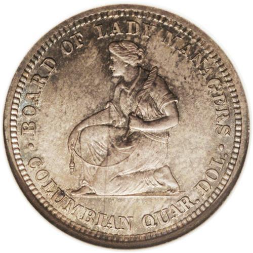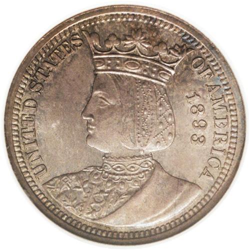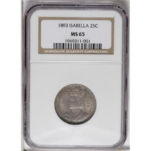 <B>1893<25C> Isabella Quarter MS65 NGC.</B></I> A lush Gem example of this popular commemorative quarter, with deep pink-gray toning accented by tinges of blue on both sides. There are few distracting marks, and the strike is well executed. The somewhat moderate luster perhaps prevents an even finer grade.
