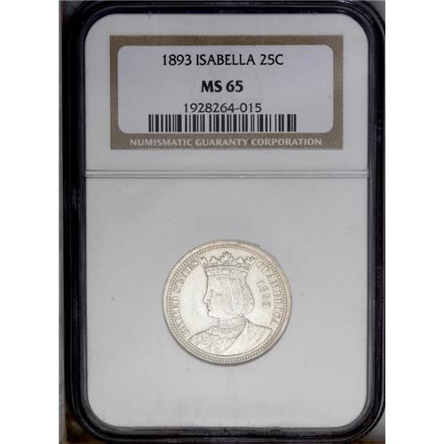 <B>1893<25C> Isabella Quarter MS65 NGC.</B></I> Frosty and bright, the mostly untoned surfaces reveal pleasing brightness in the fields. Both sides are sharply impressed with uncommonly few abrasions for the type. <BR><BR><B>Important notice:</B> Heritage usually auctions material at the rate of 200-250 lots per hour. On some occasions eBay Live bid software or the Internet may not be able to keep up with the pace of the auction. We recommend placing a realistic absentee bid now as insurance to avoid disappointment. Occasionally the auctioneer may eliminate or reject an eBay Live bid, and the auctioneer may also reopen a lot after the close of the eBay live bidding (usually because we missed an audience bid), and may reject your bid even if it shows you as the winning bidder. By bidding via eBay Live, you agree that Heritage may award the lot to another bidder at its sole discretion under the circumstances described above or any other reasonable circumstances. Since eBay bids are not shown to us until we open the lot on the floor, we treat those bids just like floor bids. In most cases the floor responds before the eBay bid is presented to us, due to Internet lag time, so for consistency we have made it a policy that floor bids are always considered first over tie eBay live bids. Also please note that all Heritage lots purchased through eBay Live carry a 20% Buyer's Premium. Please make sure you read the Terms and Conditions before you bid. This lot is being auctioned in conjunction with a live floor auction by Heritage Galleries & Auctioneers. All final auction and invoice information will be supplied by Heritage Galleries & Auctioneers, and all other information should be considered preliminary. Lot:4818 <BR><BR><B>Winning Notification and Billing:</B> After the FINAL session in this auction is complete, Heritage will send e-mail and snail mail invoices. This process normally takes several days. All final auction and invoice information will be supplied by Heritage Galleries & Auctioneers, and all other information should be considered preliminary. <BR><BR>This auction will be conducted on a live auction floor and over the Internet through eBay Live. If you choose to place an absentee bid, please take a moment to <font color='#0000ff'><u><a href='http://pages.ebay.com/liveauctions/help/before/laabsentee.html'>learn how eBay Live absentee bidding works</a></u></font><font color='#000000'>