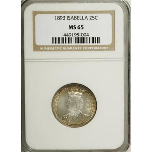 <B>1893 25C Isabella Quarter MS65 NGC.</B></I> Boldly struck with an effulgent, unbroken satiny sheen across both sides. The surfaces are well preserved and display attractive golden-brown peripheral toning. The Isabella quarter is popular as one of the two earliest American commemorative issues, along with the Columbian Exposition half dollar. <BR><BR><b>Shipping:</b> Coins & Currency (<a target="_blank" href="http://www.heritageauctions.com/common/shipping.php">view shipping information</a>)
