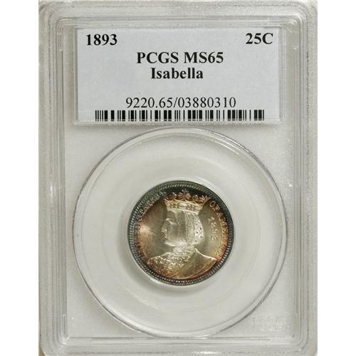 <B>1893 25C Isabella Quarter MS65 PCGS.</B></I> A strongly lustrous beauty that sports brilliant centers and bands of ocean-blue and rose-plum at the margins. While collectors today recognize the beauty of the Isabella design, few who attended the Exposition purchased the quarter, since the half dollar was available for the same price.<BR><I>From The Cary & Cheryl Porter Collection.</B></I><BR><BR><b>Shipping:</b> Coins & Currency (<a target="_blank" href="http://www.heritageauctions.com/common/shipping.php">view shipping information</a>)