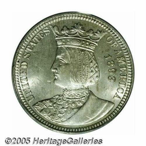 <B>1893<25C> Isabella Quarter MS65 PCGS.</B></I> Wisps of faint gold color grace this boldly struck Gem. A carefully preserved example of one of the first Silver Commemorative types. The Isabella Quarter did not sell as well as the Columbian Halves also sold at the Chicago World's Fair, because both were offered at one dollar despite the lower face value of the Isabella issue.