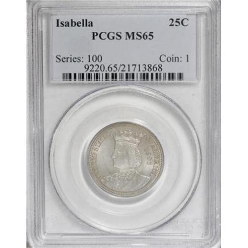 <B>1893 25C Isabella Quarter MS65 PCGS.</B></I> This attentively struck Gem has vibrant luster and medium tawny-gold and cream-gray toning. The obverse is well preserved, and the reverse has only trivial grazes. The lettering on the Isabella quarter may have been hurried. The N and T in UNITED are lightly repunched, and the A in STATES is awkwardly entered.<BR><BR><b>Shipping:</b> Coins & Currency (<a target="_blank" href="http://www.heritageauctions.com/common/shipping.php">view shipping information</a>)