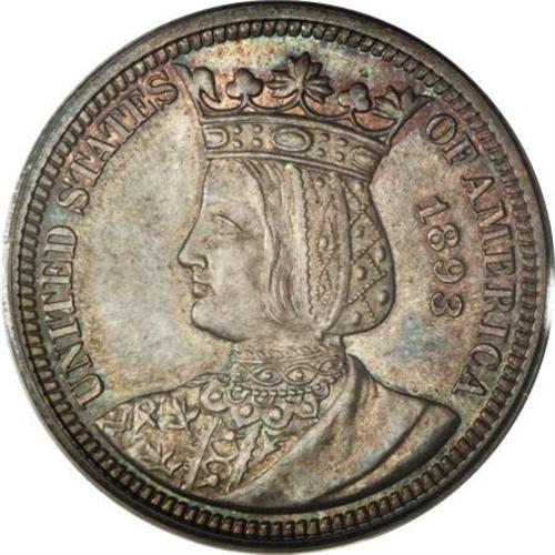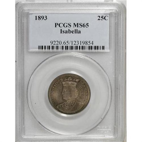 <B>1893 25C Isabella Quarter MS65 PCGS.</B></I> The nation's first commemorative quarter until the 1932 Washington quarter, originally planned as a commemorative but then turned into a continuing circulation issue. This Isabella shows deep gray patina elegantly tinged with orange and jade. Sharply struck and delightful.<BR><BR><b>Shipping:</b> Coins & Currency (<a target="_blank" href="http://www.heritageauctions.com/common/shipping.php">view shipping information</a>)