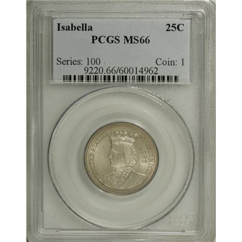 <B>1893 25C Isabella Quarter MS66 PCGS.</B></I> This Premium Gem is exceptional in surface preservation for the type. Full mint luster flows over both sides in the absence of outwardly noticeable abrasions. Sharply struck with a silver tinged obverse and some champagne iridescence adorning the reverse.<BR><BR><b>Shipping:</b> Coins & Currency (<a target="_blank" href="http://www.heritageauctions.com/common/shipping.php">view shipping information</a>)