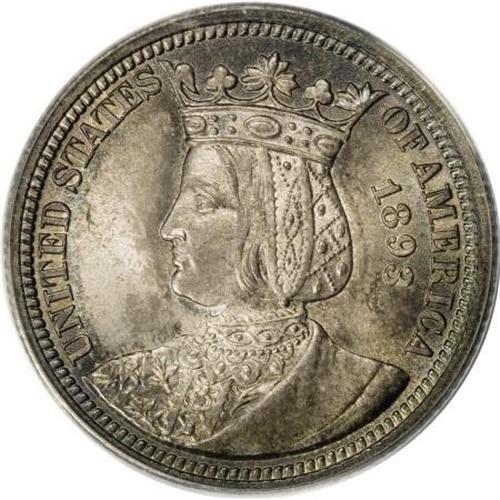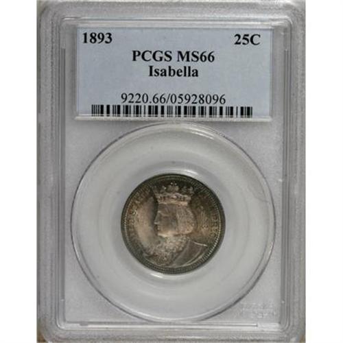 <B>1893 25C Isabella Quarter MS66 PCGS.</B></I> Deep steel-blue, sea-green, and lighter gold toning entirely cover the obverse and reverse surfaces of this splendid Premium Gem. While this commemorative quarter dollar is not particularly rare at this grade level, it is elusive any finer. PCGS has only certified 36 better examples (6/07).<BR><BR><b>Shipping:</b> Coins & Currency (<a target="_blank" href="http://www.heritageauctions.com/common/shipping.php">view shipping information</a>)