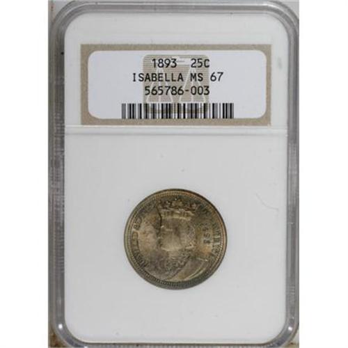 <B>1893 25C Isabella Quarter MS67 NGC.</B></I> A lovely example of this popular early issue. This piece has layers of olive-green, rose, and golden patina over the bright mint frost that glows over each side. The toning is not overpowering and adds a delicate look to the coin. Dazzling cartwheel sheen illuminates the carefully preserved fields. The strike is sufficiently sharp that both sides exhibit a wire rim. Census: 40 in 67, 9 finer (7/07).<BR><BR><b>Shipping:</b> Coins & Currency (<a target="_blank" href="http://www.heritageauctions.com/common/shipping.php">view shipping information</a>)