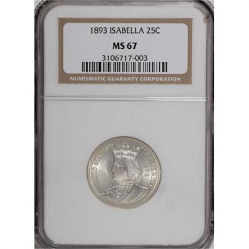 <B>1893 25C Isabella Quarter MS67 NGC.</B></I> There is no denying the Superb Gem grade assigned by NGC, as this lovely piece exhibits great luster and sharply struck design elements. Untoned surfaces are immaculately preserved. Were it not for a light graze beneath the date, this coin might well have graded higher. Census: 41 in 67, 9 finer (1/08).<BR><BR><b>Shipping:</b> Coins & Currency (<a target="_blank" href="http://www.heritageauctions.com/common/shipping.php">view shipping information</a>)