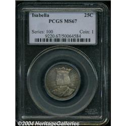 <table><tbody><tr><td><table> <TR><TD width="100%"><TABLE cellSpacing=1 cellPadding=3 width="100%" border=0><TBODY><TR><TD width="100%" bgColor=#79735c><FONT face=arial color=#ffffff size=3><B>Description</B> </FONT></TD></TR><TR><TD width="100%" bgColor=#ffffff><FONT face=arial size=2><B>1893 25C Isabella Quarter MS67 PCGS.</B></I> Original and wonderfully attractive, the fully frosted surfaces are adorned with layers of copper-russet toning that deepen to sea-green shades at the borders. While we typically offer multiple Isabella Quarters in our Signature Sales, seldom does an example possess surfaces that are smooth enough to warrant a Superb Gem rating. Population: 24 in 67, 3 finer (10/03). </FONT></TD></TR></TBODY></TABLE></TD></TR></TBODY></TABLE><BR><A name=PricesRealized></A><TABLE cellSpacing=0 cellPadding=0 width="100%" bgColor=#000000 border=0><TBODY><TR><TD width="100%"><TABLE cellSpacing=1 cellPadding=3 width="100%" border=0><TBODY><TR><TD width="100%" bgColor=#79735c><A name=PR><FONT face=arial color=#ffffff size=3><B>Previous Prices from Heritage Auctions</B> </FONT></A></TD></TR><TR><TD bgColor=#f6f6ed><TABLE cellSpacing=0 cellPadding=0 width="100%" border=1><TBODY><TR><TD align=middle width="33%"><B>Date</B></TD><TD align=middle width="33%"><B>Service</B></TD><TD align=middle width="33%"><B>Price</B></TD></TR><TR bgColor=whitesmoke><TD width="33%"><B>01/11/2003</B></TD><TD width="33%">NGC</TD><TD width="33%">$3,910.00</TD></TR><TR bgColor=whitesmoke><TD width="33%"><B>11/15/2001</B></TD><TD width="33%">PCGS</TD><TD width="33%">$8,625.00</TD></TR><TR bgColor=whitesmoke><TD width="33%"><B>11/07/1998</B></TD><TD width="33%">NGC</TD><TD width="33%">$5,280.00</TD></TR><TR bgColor=whitesmoke><TD width="33%"><B>03/21/1998</B></TD><TD width="33%">PCGS</TD><TD width="33%">$5,290.00</TD></TR><TR bgColor=whitesmoke><TD width="33%"><B>07/30/1994</B></TD><TD width="33%">NGC</TD><TD width="33%">$5,500.00</TD></TR></TBODY></TABLE></TD></TR><TR><TD bgColor=#ffffff><FONT face=arial size=1 ?>PLEASE NOTE: All prices realized reflect the final hammer price PLUS the buyer's premium in auctions that charge a buyer's premium. Each item has a notation at the top of the listing indicating whether that lot included a buyer's premium. Example: A item that sells with a final hammer price of $100 and a 20% buyer's premium will display with a price realized of $120. All information listed is intended to be as accurate as possible, but errors are possible. Please use this guide carefully and inform us of any inaccuracies. </FONT></TD></TR></TBODY></TABLE></TD></TR></TBODY></TABLE><BR><TABLE cellSpacing=0 cellPadding=0 width="100%" bgColor=#000000 border=0><TBODY><TR><TD width="100%"><TABLE cellSpacing=1 cellPadding=3 width="100%" border=0><TBODY><TR><TD width="100%" bgColor=#79735c colSpan=6><FONT face=arial color=#ffffff size=3><B>Price Guide*</B> </FONT></TD></TR><TR bgColor=#f6f6ed><TD align=middle><B>Grade</B> </TD><TD align=middle><B>Coin World<BR>(Trends)</B> </TD><TD align=middle><B>Numismedia<BR>Retail</B> </TD><TD align=middle><B>Numismedia<BR>Wholesale</B> </TD><TD align=middle><B>Coin<BR>Universe</B> </TD><TD align=middle><B>Heritage<BR>Value Index</B> </TD></TR><TR bgColor=#ffffff><TD align=middle>66</TD><TD align=right>$4,500.00</TD><TD align=right>---</TD><TD align=right>$3,320.00</TD><TD align=right>$4,800.00</TD><TD align=right>$3,140.25</TD></TR><TR style="FONT-WEIGHT: bold" bgColor=#cccfdd><TD align=middle>67</TD><TD align=right>$8,500.00</TD><TD align=right>---</TD><TD align=right>$6,000.00</TD><TD align=right>$9,800.00</TD><TD align=right>$6,857.50</TD></TR><TR bgColor=#ffffff><TD align=middle>68</TD><TD align=right>---</TD><TD align=right>---</TD><TD align=right>$13,750.00</TD><TD align=right>$30,000.00</TD><TD align=right>$21,000.00</TD></TR><TR bgColor=#ffffff><TD colSpan=6><FONT size=1>*All information listed is intended to be as accurate as possible, but errors are possible. No item may be returned or refused based on this information which is provided as a service to our customers. You should contact each pricing source directly to determine the accuracy of this information. </FONT></TD></TR></TBODY></TABLE></TD></TR></TBODY></TABLE><BR><TABLE cellSpacing=0 cellPadding=0 width="100%" bgColor=#000000 border=0><TBODY><TR><TD width="100%"><TABLE cellSpacing=1 cellPadding=3 width="100%" border=0><TBODY><TR><TD width="100%" bgColor=#79735c><FONT face=arial color=#ffffff size=3><B>Population Guide</B> </FONT></TD></TR><TR bgColor=#ffffff><TD align=middle><!-- Begin Output of Population Grid--><TABLE cellSpacing=0 cellPadding=0 width="100%" border=0><TBODY><TR><TD vAlign=center><TABLE cellSpacing=0 width="100%" border=1 cellsadding="3"><TBODY><TR><TD vAlign=center><TABLE cellSpacing=0 cellPadding=3 width="100%" border=1><TBODY><TR><TD vAlign=center align=middle bgColor=#f0f1e8 colSpan=2 <CENTER><FONT face=Arial size=2><B>PCGS Pop </B></FONT><CENTER></CENTER></TD><TD vAlign=center align=middle bgColor=#f0f1e8 colSpan=2><CENTER><FONT face=Arial size=2><B>NGC Pop</B></CENTER></FONT></TD></TR><TR><TD vAlign=center><FONT face=Arial size=2>(67)</FONT> </TD><TD vAlign=center align=right><FONT face=Arial size=2>24</FONT> </TD><TD vAlign=center><FONT face=Arial size=2>(67)</FONT> </TD><TD vAlign=center align=right><FONT face=Arial size=2>29</FONT> </TD></TR><TR><TD vAlign=center><FONT face=Arial size=2>(>67)</FONT> </TD><TD vAlign=center align=right><FONT face=Arial size=2>3</FONT> </TD><TD vAlign=center><FONT face=Arial size=2>(>67)</FONT> </TD><TD vAlign=center align=right><FONT face=Arial size=2>8</FONT> </TD></TR></TBODY></TABLE></TD></TR></TBODY></TABLE></TD></TR></TBODY></TABLE><!-- End Output of Population Grid--></TD></TR></TBODY></TABLE></TD></TR></TBODY></TABLE><BR><TABLE cellSpacing=0 cellPadding=0 width="100%" bgColor=#000000 border=0><TBODY><TR> <font color='#000000'><span style='background-color: #FFFFFF'><td bgcolor='#FFFFFE'> Important notice: Heritage usually auctions mater