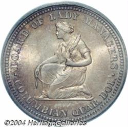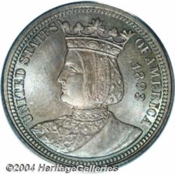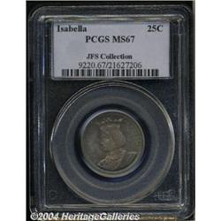 <B>1893<25C> Isabella Quarter MS67 PCGS.</B></I> Rich sea-green and electric-blue colors endow the obverse field, while the portrait of Queen Isabella has vivid peach patina. The central reverse is dominated by luminous orange and steel-gray colors, which are framed by peripheral ruby-red and navy-blue hues. This well struck Superb Gem has splendid cartwheel luster and attractively preserved surfaces. Along with Leif Ericson, Queen Isabella of Spain is one of two foreign monarchs to appear on a U.S. coin. She financed Columbus' 1492 voyage that led to the discovery of America. Examples were sold at the 1893 Columbian Exposition in Chicago, in addition to the more available 1892 and 1893 Half Dollars with Columbus' portrait. Population: 27 in 67, 4 finer (6/04).<BR><I>From the JFS Collection, the #1 All-Time PCGS Registry Set.</B></I> <BR><BR><B>Important notice:</B> Heritage usually auctions material at the rate of 200-250 lots per hour. On some occasions eBay Live bid software or the Internet may not be able to keep up with the pace of the auction. We recommend placing a realistic absentee bid now as insurance to avoid disappointment. Occasionally the auctioneer may eliminate or reject an eBay Live bid, and the auctioneer may also reopen a lot after the close of the eBay live bidding (usually because we missed an audience bid), and may reject your bid even if it shows you as the winning bidder. By bidding via eBay Live, you agree that Heritage may award the lot to another bidder at its sole discretion under the circumstances described above or any other reasonable circumstances. Since eBay bids are not shown to us until we open the lot on the floor, we treat those bids just like floor bids. In most cases the floor responds before the eBay bid is presented to us, due to Internet lag time, so for consistency we have made it a policy that floor bids are always considered first over tie eBay live bids. Also please note that all Heritage lots purchased through eBay Live carry a 20% Buyer's Premium. Please make sure you read the Terms and Conditions before you bid. </span></font></tr></table></td></tr></table>