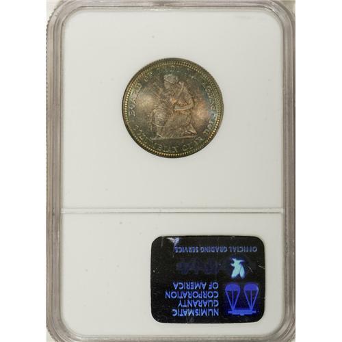 <B>1893 25C Isabella Quarter MS68 NGC.</B></I> Following the well-publicized distribution of the first Columbian halves, the Board of Lady Managers obtained a souvenir issue of their own, largely due to the efforts of Mrs. Potter Palmer, whom Q. David Bowers (1991) described as a "well-known Chicago socialite, patron of the arts, and <I>grand dame</B></I> of the Exposition." The 40,000 pieces authorized represented $10,000 of the funds disbursed to the Board, one of the first instances of the Mint supplying commemoratives to an authorized party at face value.<BR> The first impression of this delightful example is one of elegant color. On the obverse, shades of peach and rose appear at the center, while the margins have blue-green and violet patina. The reverse has bands of sapphire at the top and bottom, while the middle has amethyst and orange hues and a thin ring of emerald graces the rim. Vibrant luster further augments the outstanding eye appeal of this captivating coin. Even in near-Gem, pleasing Isabella quarters are elusive, and every step up the grading scale heightens the challenge. NGC has graded seven pieces in MS68, and PCGS has certified four; one of those is the same coin listed as MS69 by NGC, the only finer example listed by either service (3/07).<BR><I>From The Cary & Cheryl Porter Collection.</B></I><BR><BR><b>Shipping:</b> Coins & Currency (<a target="_blank" href="http://www.heritageauctions.com/common/shipping.php">view shipping information</a>)