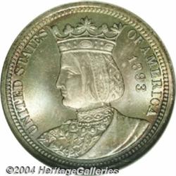 <B>1893<25C> Isabella Quarter MS68 PCGS. Graded MS69 by NGC. MS69 NGC Tag # 163965-001 accompanies this lot.</B></I> Like the 1892-1893 Columbian Half Dollar, the Isabella Quarter was produced to help raise funds for the World's Columbian Exposition in Chicago. The lobbying party for this Quarter was the Exposition's Board of Lady Managers, and the design was executed by Charles E. Barber. A rendition of Isabella of Castilla, Queen of Spain and the patron of Christopher Columbus, dominates the obverse. The reverse depicts a fictitious woman kneeling with a distaff and spindle--a symbol of woman's industry. Survivors of the 24,214 business strikes distributed are difficult to locate in grades above the MS64 level of preservation, and are rarely offered finer than MS66.<BR> We have seen one finer 1893 Isabella Quarter, that being an MS69 from NGC which we offered in our July, 2002 New York Signature Sale. The surfaces display a cornucopia of rainbow colors that yield to antique-copper shades as the surfaces turn away from the light. The luster is simply breathtaking with a vibrant, frosty texture. A razor sharp strike and pristine features round out this coin's list of positive attributes. Not surprisingly, this is tied with two other MS68s as the finest Isabella Quarter known to PCGS (6/04).<BR><I>Ex: New York Signature Sale (Heritage, 7/02), lot 5040, which realized $46,000.</B></I><BR><I>From the JFS Collection, the #1 All-Time PCGS Registry Set.</B></I> <BR><BR><B>Important notice:</B> Heritage usually auctions material at the rate of 200-250 lots per hour. On some occasions eBay Live bid software or the Internet may not be able to keep up with the pace of the auction. We recommend placing a realistic absentee bid now as insurance to avoid disappointment. Occasionally the auctioneer may eliminate or reject an eBay Live bid, and the auctioneer may also reopen a lot after the close of the eBay live bidding (usually because we missed an audience bid), and may reject your bid even if it shows you as the winning bidder. By bidding via eBay Live, you agree that Heritage may award the lot to another bidder at its sole discretion under the circumstances described above or any other reasonable circumstances. Since eBay bids are not shown to us until we open the lot on the floor, we treat those bids just like floor bids. In most cases the floor responds before the eBay bid is presented to us, due to Internet lag time, so for consistency we have made it a policy that floor bids are always considered first over tie eBay live bids. Also please note that all Heritage lots purchased through eBay Live carry a 20% Buyer's Premium. Please make sure you read the Terms and Conditions before you bid. </span></font></tr></table></td></tr></table>