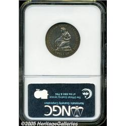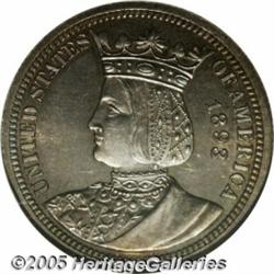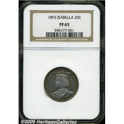 <B>1893 25C Isabella Quarter PR65 NGC.</B></I> The Isabella quarter is rarely encountered as an unquestioned proof striking. Records indicate that only 103 proofs were struck. The proofs were the first hundred strikes from the die, to be eventually followed by the symbolic 400th, 1492nd, and 1892nd coins struck, for a total of 103 pieces. While specific diagnostics are lacking for this issue, this piece, as with all genuine proofs, shows remarkable strength of detail. The centers are very sharply defined with especially sharp detailing on Queen Isabella's hair, the ruffled collar, the brocaded or embroidered garment, the lappet of her snood, the folds in the spinner's sleeve, the locks of her hair, the twists in her yarn, and the continuous line from distaff to spindle even where it crosses her thigh. The fields are evenly and deeply mirrored on each side. Close examination of the fields show light flow lines, indicating that this was likely one of the later proofs struck. Golden-rose toning is seen over each side with lilac patina intermixed. The only pedigree identifiers worthy of mention are two tiny planchet flakes in the fields in a line with the C in AMERICA in the lower obverse field. One of the finest examples known of this important commemorative rarity. Population: 4 in 65, 2 finer (2/05).