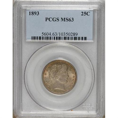 <B>1893 25C MS63 PCGS.</B></I> PCGS Population (67/82). NGC Census: (51/96). Mintage: 5,444,815. Numismedia Wsl. Price for NGC/PCGS coin in MS63: $292. (#5604)<BR><BR><b>Shipping:</b> Coins & Currency (<a target="_blank" href="http://www.heritageauctions.com/common/shipping.php">view shipping information</a>)