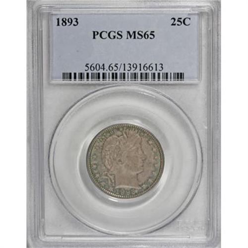 <B>1893 25C MS65 PCGS.</B></I> The meager saving of early Barber pieces had dropped off almost completely by 1893, and Gem and better pieces are scarce as a consequence. This richly toned piece, solidly struck with deep violet and sea-green patina, offers exquisite preservation. Population: 18 in 65, 4 finer (8/07).<BR><BR><B>Coin Engraver:</B> Charles E. Barber<BR><BR><b>Shipping:</b> Coins & Currency (<a target="_blank" href="http://www.heritageauctions.com/common/shipping.php">view shipping information</a>)