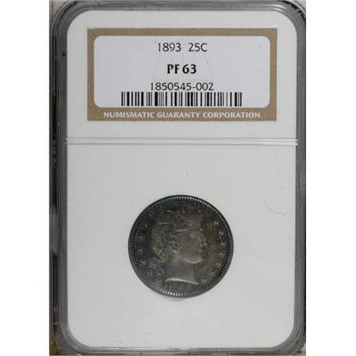 <B>1893 25C PR63 NGC.</B></I> NGC Census: (14/182). PCGS Population (45/141). Mintage: 792. Numismedia Wsl. Price for NGC/PCGS coin in PR63: $535. (#5679)<BR><BR><B>Coin Engraver:</B> Charles E. Barber<BR><BR><b>Shipping:</b> Coins & Currency (<a target="_blank" href="http://www.heritageauctions.com/common/shipping.php">view shipping information</a>)