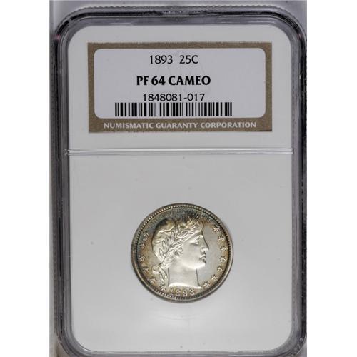 <B>1893<25C> PR64 Cameo NGC.</B></I> Though part of Liberty's cap has champagne and violet toning like the fields, the rest of Liberty is pale cream, optimal for cameo contrast. A moderately mirrored specimen with two small marks on the jaw.<BR><I>Ex: Stack's, 2/51, lot 108.</B></I><BR><I>From The Redfjord Collection.</B></I>