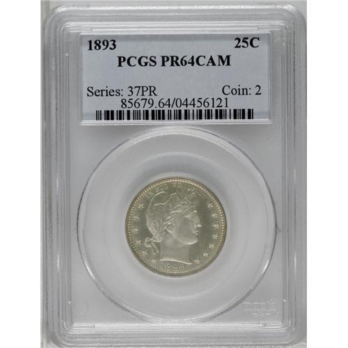 <B>1893<25C> PR64 Cameo PCGS.</B></I> Sharply struck and extremely attractive with highly lustrous devices and nicely mirrored fields. A few wispy hairlines in the obverse field are all that keep this from a Gem grade.